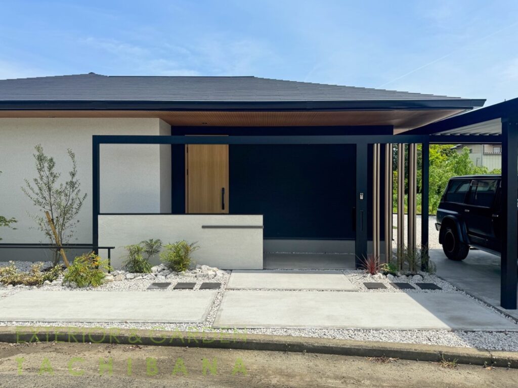 施工事例|シンプルな平屋に映えるモダンな外構
