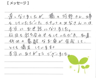 K様 : いつも笑顔で親切に対応して頂き、安心して工事を見ていました。