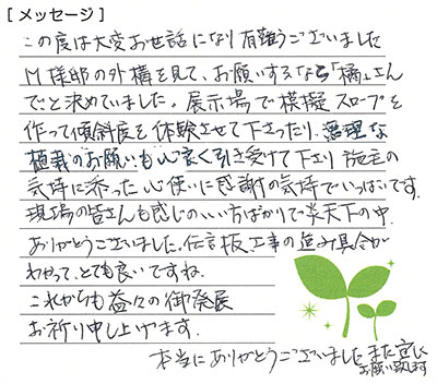 この度は素晴らしい外構工事をしていただきまして、誠に有難うございました。とても素敵な外観に家族一同