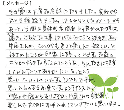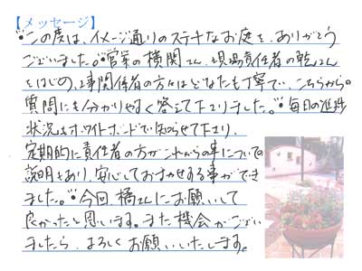 家に合ったイメージに仕上げて頂いて大変喜んでいます。工事の方の丁寧な作業ぶりには感心しました。