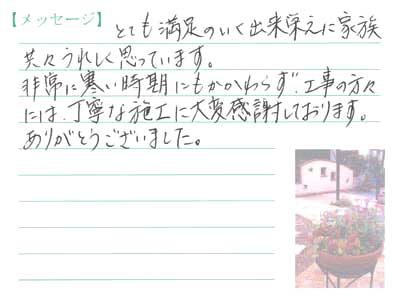 大変お世話になり、ありがとうございました。イメージ通りの色合い・デザインでとても素敵に仕上り、家族皆喜んでいます。
