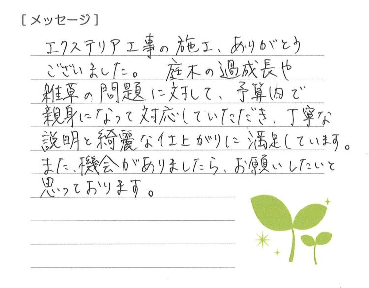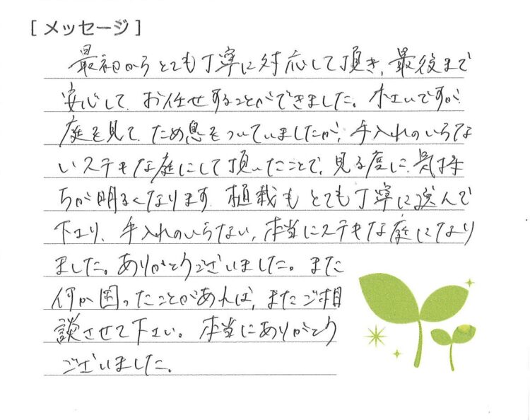 私達が見落としていた細部の箇所にまでその都度配慮した施工をしていただき思っていた以上の