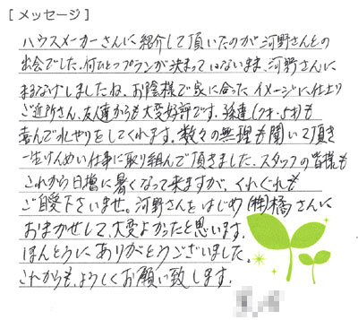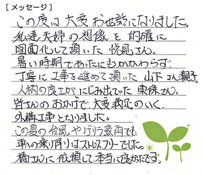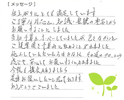 施工もとても丁寧でしたし、出来上がりにも満足しています。ありがとうございました。