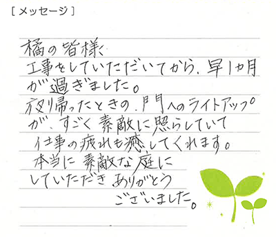 工事中も現場監督の武原さん他スタッフの皆さん良心的に対応していただき有難うございました。