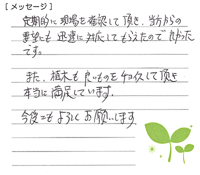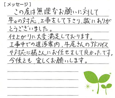 着工においては始終作業の方が誠心誠意取り組んでくださり仕事ぶりを見て安心と満足を実感しているありがとう