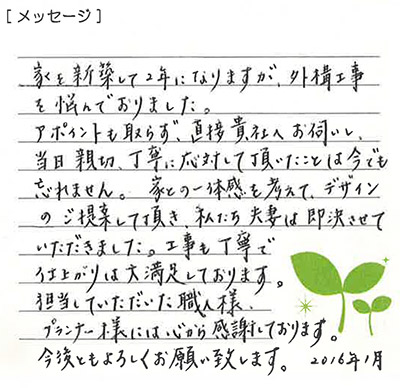 今回、新築の為、外構工事をお願いしました。予算の都合もあり、もっと力を入れた外構工事を
