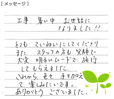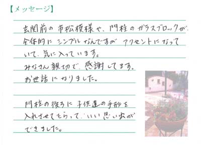 打ち合わせの回数が少なかったですが、イメージ以上の外構の出来に、家族一同とても喜んでおります。