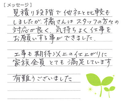 私達の小さな要望にも、すぐに応じて下さり、工事中も便利に過ごす事ができ助かりました。