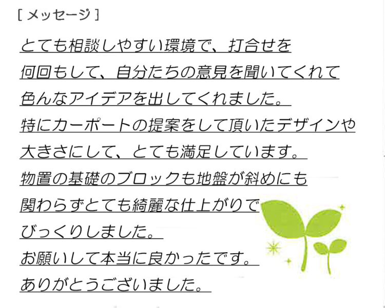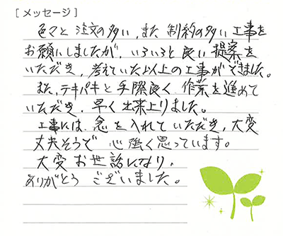 先日は大変お世話になりました。リフォームという地味で面倒な工事でしたが、