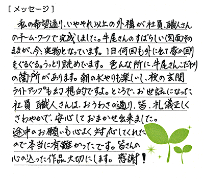 牛尾さんをはじめ、施工頂いた方にも大変お世話になりました。本当にありがとうございました。