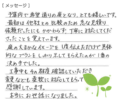 本当にありがとうございました。思っていた以上の出来栄えに、いつもは辛口評価の私も大変満足しております。
