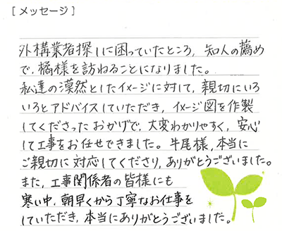 マイホームが完成してから3年も経ち、ようやくエクステリアが決まりました。それも担当の牛尾さんに