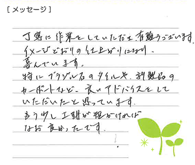 出会えたからこそです。私達の希望を聴いて頂き、悩んで決めれずにいたことを全て形にしてもらえた事など、