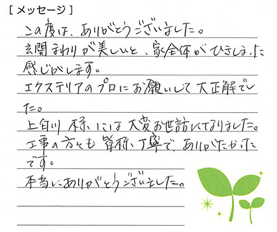 素敵なお庭ができ、毎日が楽しく、庭を見る度に幸せな気持ちになります。本当に有難うございました。