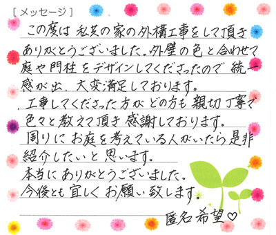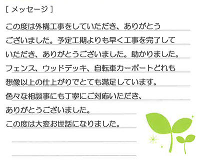 仕上がりは想像以上でとても満足しています。工事も暑い中でしたが、ありがとうございました。
