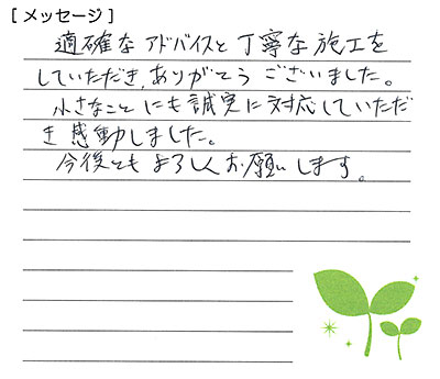 上白川様には大変お世話になりました。工事の方も皆様丁寧で、ありがたかったです。
