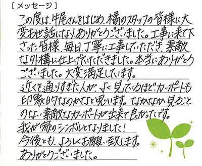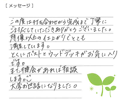 工事にかかるまで何回も打ち合わせをして、親身になって相談にのって頂き、ありがとうございました。