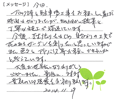 この度は大変お世話になりました。お店にうかがっての相談から現地調査、提案、工事、完成、