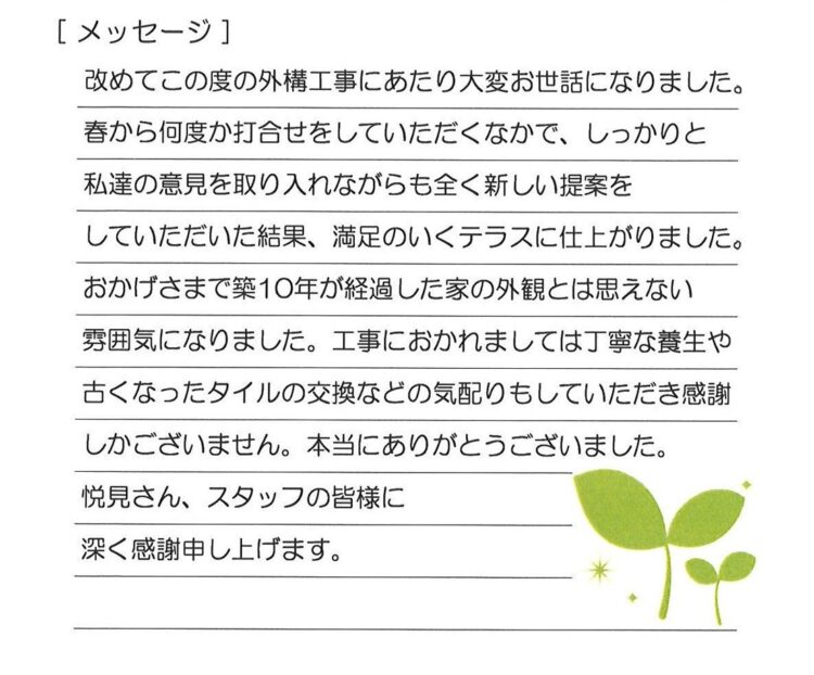 この度は、お世話になり有難うございました。南欧プロヴァンス風の庭の中で、ゆっくりビールでも飲んで、