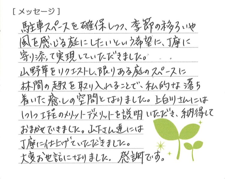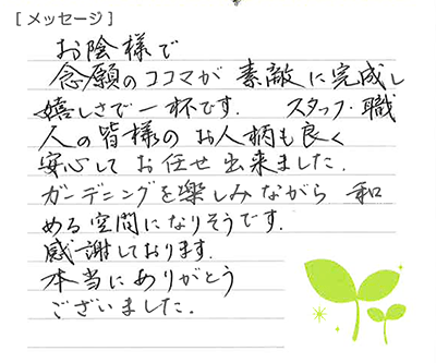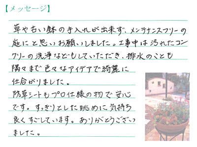 結果的には手間のかからないすっきりした庭になってよかったです。お世話になりありがとうございました。