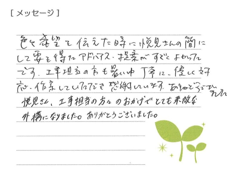 また、植木も良いものをチョイスして頂き本当に満足しています。今後ともよろしくお願いします。