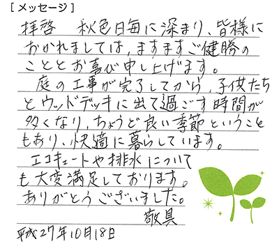 本当にありがとうございました。丁寧にお仕事してくださった皆様方によろしくお伝えください。