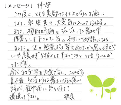 思ったとおりの施行もとても丁寧にして下さり満足しています。