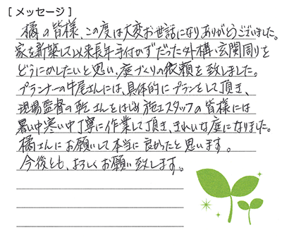 丁寧なお仕事していただき、家族一同とても満足して喜んでいます。